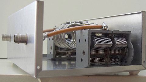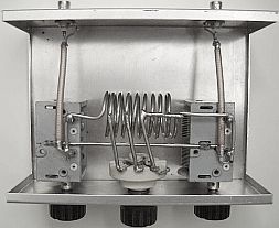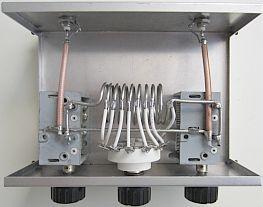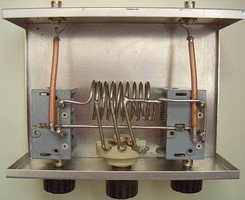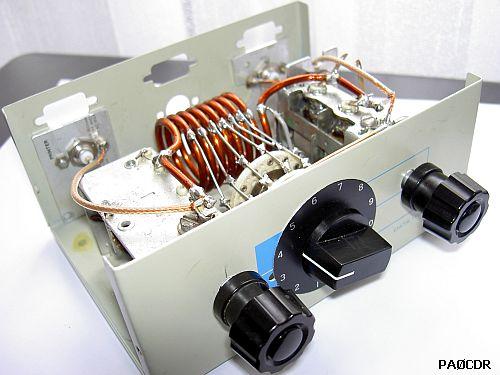 The design is a classic pi filter consisting of an inductor with taps and two variable capacitors. Construction is easy because no insulated shafts or insulated mounting of the capacitor is required.