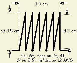 The inductors has been constructed from ordinary unshielded # 10 wire (2.5 mm²) which normally (in NL) is used for grounding purposes in the mains wiring. Six windings with an inside diameter of 1 1/14 " (3cm «fig) are generally sufficient. For me 5 windings were sufficient and the rest of the inductor was shorted.