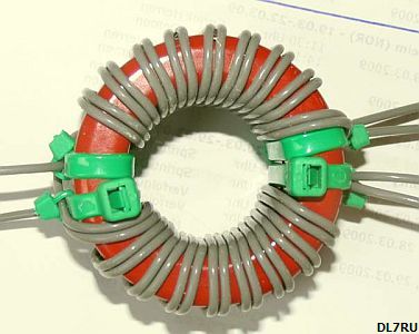 DL7RU has personally experienced that it is not easy to wind Teflon covered wire on a toroid and keep them firmly in place. DL7RU: I have now found a method to do the job much easier. First of all, I start with a couple of tight pulled cable ties on each side of the toroid. Under these ties I put smaller and thinner ones. This fixes the beginning and end of the windings so that it is easier to settle the wires.