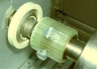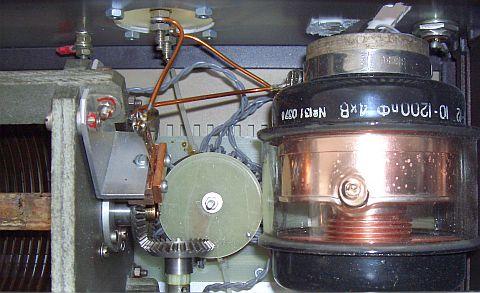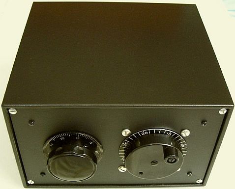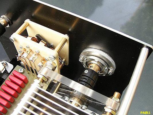 The toroid is a T184-2 («fig) and it was chosen because it needs less winding to obtain the 3 uH inductance than the other toroids. That means less parasitic capacitance. The windings are #16 gauge Thermaleze (2 kV isolation) with Teflon tubing. Primary is 11 windings (exactly 3 µH) and the secondary is 2 × 5 windings (fits evenly between the primary windings: if the primary was 10 windings then 1 secondary winding would not be 'nested' between two windings of the primary). As 'base' I used 10 mm Plexiglas. But do not use black Plexiglas (like I did): it shows every speck of dust in a photograph! The cover is made of solid walnut, which just rests on the Plexiglas and is held in place by the groove that sits over the edge of the front panel. In this way it is easily removed for once a year cleaning and re-lubrication (very sparingly with the proper conductive lubricant) of the roller inductor wheel.