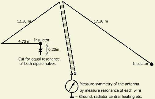Uiteindelijk werd van beide helften de resonantie met een antenne analysator gemeten zoals dat op de afbeelding getekend is. Men kan het ook met een dipmeter doen. Als aarde of tegencapaciteit werd (in de shack) een buis van de CV gebruikt. Links was 2490 kHz en rechts 2580 kHz. Links was dus elektrisch te lang. Door ongeveer 20 cm aan het uiteinde van het teruggevouwen deel te laten hangen werd door steeds knippen, de resonantie ook op 2580 kHz gebracht. Qua antennestroom is, behalve de 10 m band, op de andere 12 - 160 m banden de symmetrie goed.