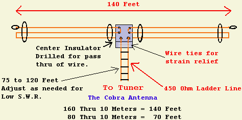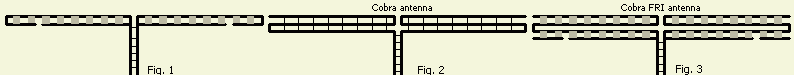 Dat is grotendeels nonsens want universitaire onderzoekers hebben vastgesteld dat zo'n dipool hoogstens 1 dB verlies geeft ten opzichte van een normaal gesterkte antenne en dat alleen de karakteristieke impedantie en bandbreedte verminderen. Met een open lijn en antenne tuner heeft u geen last van de laatste twee eigenschappen. In de praktijk is dan ook bewezen dat het goed werkt en een meer extreme uitvoering van dat principe ziet u als Cobra antenne (fig»). Een antenne die "verlengd" wordt met stubs en dat is een vorm van "linear loading" Deze antenne wordt al door een paar collega zendamateurs met succes, ook op de 160 m, gebruikt. Maar ook hier bleek dat op bij voorbeeld de 17 m band het resultaat wat minder is. In figuur 3 kan met twee naast elkaar aangebrachte lintlijnen zelf een Cobra FRI gemaakt worden die geschikt is voor een extra frequentiegebied naar eigen keuze. Op de plaatsen van onderbreking zal een mechanische versterking aangebracht moeten worden om de trekbelasting op de andere draad op te vangen.