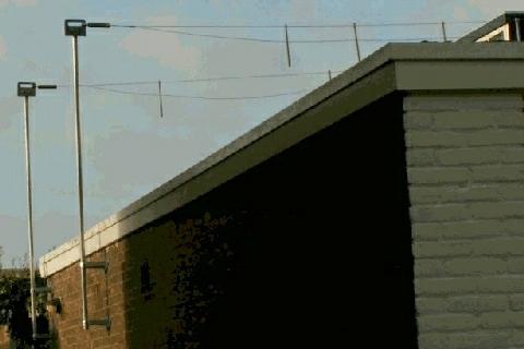 Heeft u een plat dak dan, kan als effectieve tegen capaciteit een stervormig of spiraalvormig patroon van draden aangelegd worden. Benut de oppervlakte zo goed mogelijk. Nogmaals, hang zoveel mogelijk draad op en betrek eventueel een gedeelte van de tuin erbij.
