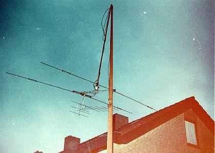 Ook met een geringe hoogte boven (fig») het dak kan men toch goede verbindingen en DX werken. De antenne situatie op de foto lijkt sprekend op mijn antenne in een vorige woonplaats. Mijn mast was ongeveer