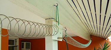 Als de eigenaar geen toestemming verleent voor het maken van bevestigingen of ophangpunten, kunt u kruisvormige constructies maken van metaal of geïmpregneerd tuinhout. Toen ik nog op de bovenste verdieping van een flat woonde, waren dergelijke kant en klare dingen niet te koop en moest dat zelf (zie onderstaande tekening) gemaakt worden. Zo'n statief kan tegen omvallen verzwaard worden met bij voorbeeld goedkope (sloop) grindtegels.