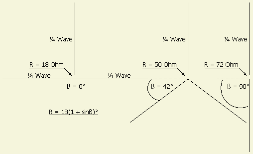 Een verticale antenne met twee radialen die 180° uit elkaar liggen is een effectieve antenne. Het systeem is gebaseerd op patenten uit 1933 en 1934. Een vereenvoudigde formule voor het voedingspunt is: R = 18(1 + sin ß)² ß is de hoek van de radialen ten opzichte van het horizontale vlak. Als ß = 0° wordt R = 18(1 + 0)² = 18 Ohm en als ß = 42° wordt R = 18(1 + 0.67)² = 50 Ohm met ß = 90° wordt de antenne een dipool met R = 72° |