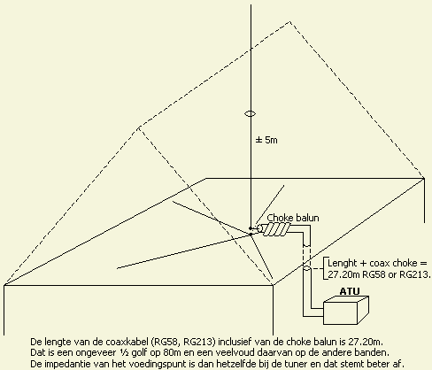 Met weinig mogelijkheden moet men naar alternatieven zoeken. Geruime tijd heb ik gewerkt met een groundplane (fig») op zolder. Een ongeveer 5 m lange (ex army) spriet werd waterdicht door het dak gevoerd en een aantal even lange geïsoleerde draden op de zoldervloer vormde een tegencapaciteit. Gevoed werd met coaxkabel omdat het aanleggen van een open lijn bouwkundig gezien te drastisch was. Door een lengte te nemen van 27.20 m RG58 of RG213 coaxkabel verkrijgt men ongeveer een ½ golf op 80 m en een veelvoud daarvan op de andere banden. Genoemde lengte bleek voor 10, 15, 20, 40 en 80 m banden een goed compromis te zijn om de impedantie van de antenne naar een redelijke waarde voor de tuner te transformeren. Daarmee "ontlast" men een tuner en de kans dat alles op SWR = 1 afgestemd kan worden, wordt groter. De lengte van 27.20 m is inclusief het stuk coaxkabel dat men eventueel voor een (aan te bevelen) choke balun gebruikt en 13.60 m is geschikt tot en met de 40 m band. Neem liefst kabel met zo weinig mogelijk verliezen, dus RG213 en niet RG58, want met de laatste kabel is het verlies op 10 m ongeveer 10 dB! Bij een nog betere kabel met een andere verkortingsfactor, moet u zelf de lengte van een ½ golf moeten afmeten. Er zullen wel weer een paar mensen zijn die kritiek hebben over het verlies van de ½ golf kabel op HF, maar men vergeet dat ook op 2 m ½ golf kabels als transformator worden gebruikt en daar hoort men niets over.