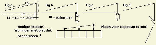 Dit (fig») zijn oplossingen voor rijtjeswoningen met een plat dak waarbij een voeding in het midden van de antenne niet kan omdat de zendamateur woont in het tweede huis van rechts. De buren moeten dan wel toestemming verlenen voor het plaatsen ervan boven hun opstal.