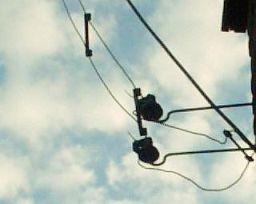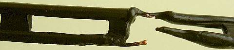 Welnu het licht was niet nodig want de lintlijn brandde echt als een fakkel op ongeveer 1 m onder het voedingspunt! Ik was blij dat het niet overdag gebeurde met nieuwsgierige buren als toeschouwers. Gelukkig werd het vuur vrij snel gedoofd door de slagregen. Met droog weer was zeker meer van de lijn in rook opgegaan. Overdag werd de schade (fig») opgenomen en het bleek inderdaad dat één van dunne koperdraden zelfs door de hitte gesmolten was. Zie het bolletje aan het draadeinde.