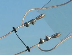 Een methode die hier toegepast wordt en al meer dan 30 jaar zijn nut bewezen heeft, is het vastmaken met binddraad. Daarmee wordt het geïsoleerd draad niet beschadig. Door de flexibiliteit van de isolatie blijft de bevestiging behouden. Tot noch toe hebben deze verbindingen alle stormen doorstaan. Het binddraad is een met was geïmpregneerde (glasvezel?) draad dat vroeger onder andere bij de voormalige PTT in gebruik was. De toegepaste knoop of lus heb ik destijds afgekeken van een sportvisser die daarmee zijn haakje aan de lijn vastmaakte. De knoop zal vast wel bij de marine of scouting een naam hebben.