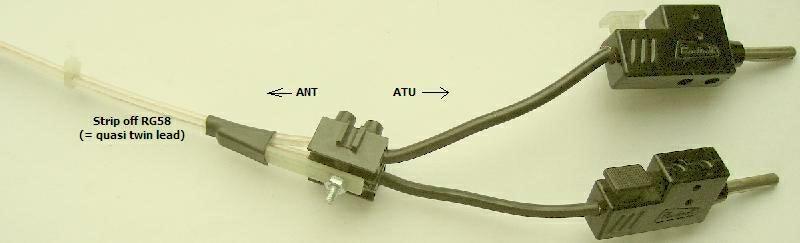 Mijn (fig») vorige binnenshuis "lintlijn": twee gestripte RG58 coaxkabels, een kunststof kroonsteentje en een soort trekontlasting. Zelfs met ongeveer 1 kW geen overslag tussen de draden of kroonsteen. Het dient als verbinding tussen de doorvoer in de muur en een symmetrische antenne tuner.