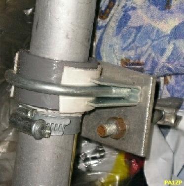 Verder maakt hij veel gebruik van Hydraulica leidingklemmen als isolator van antennes. Ze zijn gemakkelijk, goedkoop en een van de merken is (fig») Stauff http://www.stauff.com/. De klemmen zijn er in ontzettend veel maten. Zij worden geleverd door de groothandel in hydraulica materiaal. Hij koopt het spul bij PEHAVO in Oss. Er zijn ongeveer 15 maten in voorraad zoals 30, 42, 48.3 en 50 mm. Het kost niet veel inclusief alle standaard bouten en plaatjes met schroefdraad. Een stukje Alu plaat met een uitlaatklem wordt een prachtige antenne isolator met mastklem. Hij maakt veel gebruik van het aangeboden materiaal. GB Towers gebruikt ze ook als isolator voor zijn antennes. Tot zover zijn bevindingen.