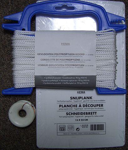 Goedkoop en sterk antenne materiaal: snijplankje (HEMA), koord (HEMA) en isolator (Boerenbond). |