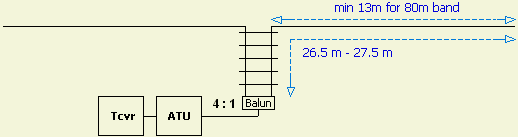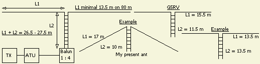 Mijn ervaring met deze balun is dat de lengte van een halve dipool plus de lengte van voedingslijn ongeveer 27 m (26.5 -27.5 m) moet zijn voor 10 t/m 80 m. Met deze afmeting wordt aan de balun een niet te lage of te hoge impedantie aangeboden. Bij de bekende G5RV zou de voedingslijn dan ongeveer 11.5 m moeten worden.