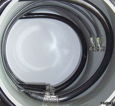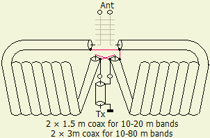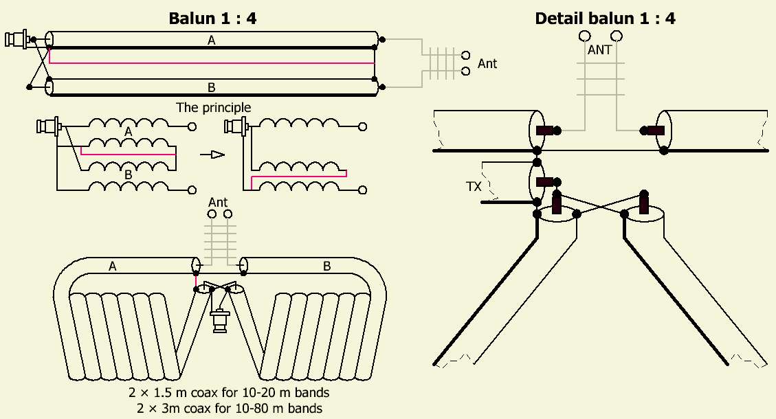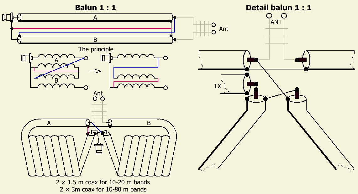 Mijn bouwsel (voor binnenshuis zie boven) wijkt af van het door PAØSE gepubliceerde model. Het een en ander was het resultaat van experimenteren nadat een artikel in Technical Topics in RadCom van RSGB gelezen was. Het is frappant dat onafhankelijk van elkaar beide constructies hetzelfde geworden zijn. De kabels (RG-213/U) zijn tegendraads gewikkeld op een 12.5 cm diameter vorm en naar binnen gebracht op zodanige wijze dat alle uiteinden zo dicht mogelijk bij elkaar uitkomen. Dat laatste bevordert de symmetrie in hoge mate en vermindert de toegevoegde zelfinductie van de onderlinge verbindingen. De punten van lage impedantie liggen bij elkaar en van hoge impedantie met lange toevoerdraden uit elkaar. Met het nadeel van langere verbindingen kunnen de spoelen kunnen ook op twee aparte kokers aangebracht worden.
