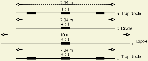 Van de Yagi, in figuur a is slechts de dipool getekend. Werd het trapsysteem vervangen door een dipool (fig b) van gelijke lengte en gevoed met 1 ÷ 4 balun, dan was ik zwakker dan met (fig a) de originele beam. Vervolgens werd een halve golf (fig c) voor 20 m met 1 ÷ 4 balun gemonteerd en dat was weer even sterk als vroeger. Tenslotte werd de originele trap dipool weer teruggeplaatst en gevoed met 1 ÷ 4 balun. Er werd geen verschil vastgesteld met de originele Yagi, alleen was het nu mogelijk om met behulp van een tuner uit te komen op 10, 12, 15, 17 en 20 m. Als bijzonderheid kon op 15 m gewerkt worden zonder tuner en met ongeveer 20 m coaxkabel was de SWR < 1.5 op die band.