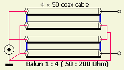 Het systeem bestaat uit twee gelijke lengtes coaxkabel (fig») die aan de ene kant parallel en aan de andere kant in serie geschakeld zijn. Met 50 Ω of 75 Ω coaxkabel betekent dat er een transformatie plaats vindt van respectievelijk 25 Ω : 100 Ω en 37.5 Ω : 150 Ω.