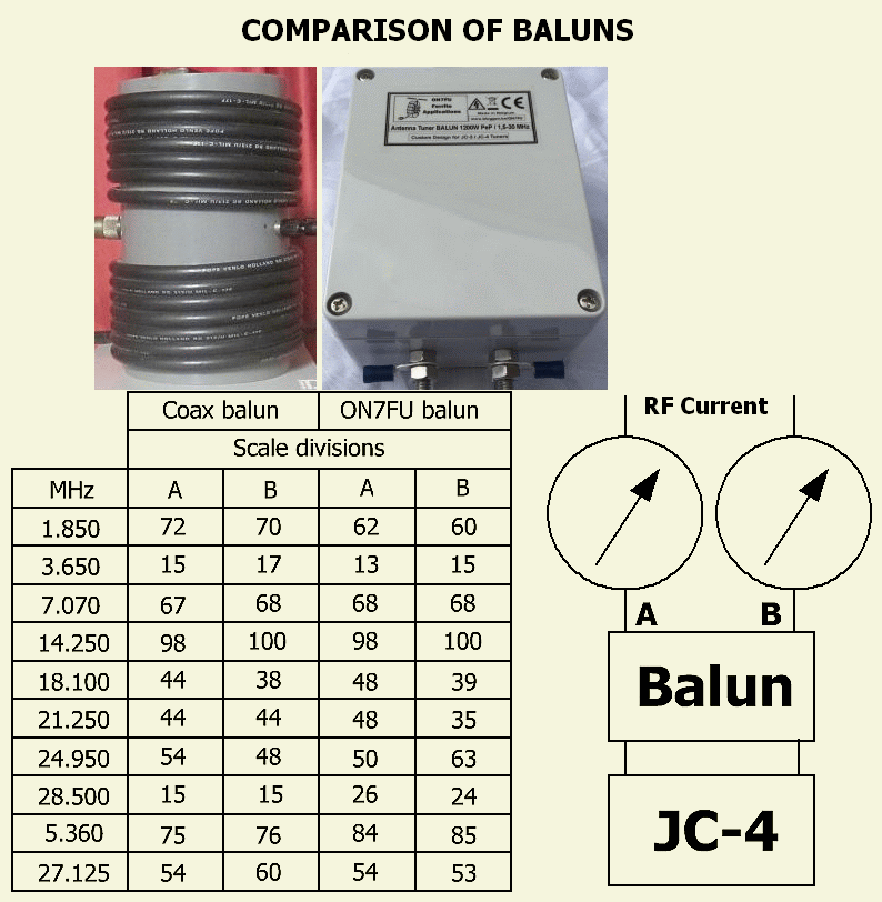 Een coax balun en ON7FU balun zijn met elkaar vergeleken met mijn (fig») huidige antenne. De test werd gedaan met 100 Watt met de balun tussen JC-4 en het HF stroomsysteem met twee meters. Men ziet dat beide baluns niet van elkaar onderdoen om van asymmetrisch een goed symmetrisch systeem te maken.