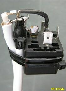 Een nog beter isolerend effect bereikt men door het toevoegen van een mantelstroom filter (choke balun). Breng daartoe ongeveer 3 meter extra coaxkabel aan door dat als spoel onder de balun te wikkelen. In feite is dat het laatste gedeelte van de coaxkabel tussen ATU en balun. PE1FGG volgde dat advies op en monteerde tevens in de spoelvorm een relais om op afstand te kunnen kiezen uit een 1 ÷ 4 of een 1 ÷ 1 overzet verhouding. Rechtsboven ziet u de omschakelbare balun gedurende een testperiode en rechts het witte "artistieke" eindproduct. Zijn bevindingen: