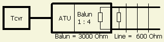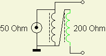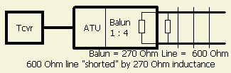 («fig) Voor een goede overdracht van een 3.5 MHz signaal is het gewenst dat de impedantie van balun/trafo ongeveer 5 × groter is dan dat van de voedingslijn: 5 × 600 = 3000 Ω. Dat is 136 µH bij 3,5 MHz en dat betekent voor een T200-2 een secundaire spoel van 106 windingen of wel een bifilaire spoel met 53 windingen. Het zal nu duidelijk zijn waarom een balun met een T200-2 ringkern en te weinig windingen aan de uitgang van (veel commerciële) tuners niet altijd een goede keus is.