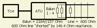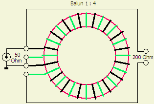Aan de 200 Ω zijde (fig») van een 1 ÷ 4 balun staan twee spoelen van 16 windingen (2 × 16) in serie. De zelfinductie die parallel aan de openlijn staat, is dan voor een T200-2 ringkern (Al = 12nH):