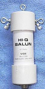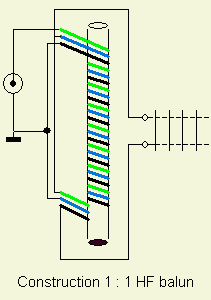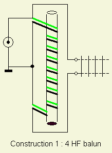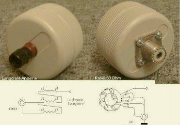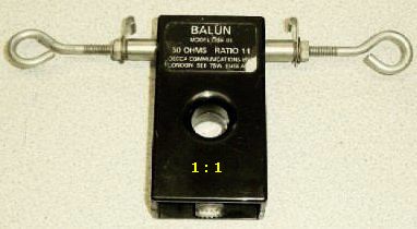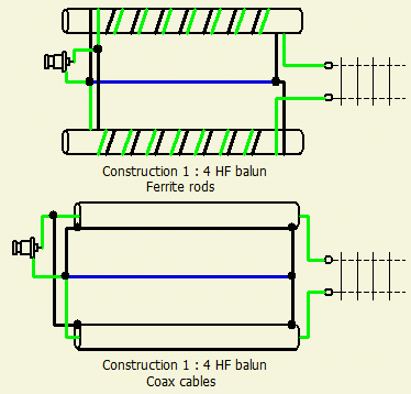 Boven een 1 kW/1 ÷ 1 balun (€70 - €100) van een Hy-gain met 3 × 9 windingen op een dikke ferrietstaaf. Als dat zelf gemaakt wordt met een ferrietstaaf uit een AM radio, is zo'n constructie geschikt voor ongeveer 400 W en is veel goedkoper. Met meer staven bijeengebundeld kan men hetzelfde bereiken als met de Hy-gain balun.
