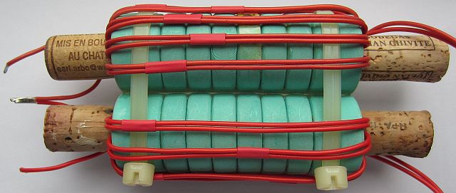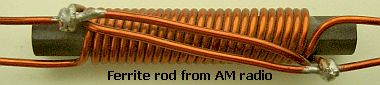 Met een ferrietstaaf (fig») uit een oude AM transistorradio kan een uitstekende balun gemaakt worden die zelfs breedbandiger kan zijn dan met een ringkern. Dat komt omdat op de staaf alle windingen over de hele lengte tegen elkaar liggen. Bij een ringkern liggen de windingen aan de buitenste rand nooit tegen elkaar. De zelfinducties aan de 200 Ω kant met drie verschillende ferrietstaven waren: van links naar rechts: 50 µH/2 × 19 wdgn, 30 µH/2 × 12 wdgn en 15 µH/2 × 9 wdgn. Als u ervoor zorgt dat zo'n balun een geschikte impedantie aangeboden krijgt, dan kan een staaf van 10 cm lang en 10 mm diameter zelfs 400 W output aan.