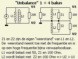 Het nadeel van dit type balun is dat de uitgang niet voor de volle 100% in balans is. Daarom werd het weinig door mij gebruikt. Om het een en ander te verduidelijken is in de tekening de uitgang belast met 200 Ω (2 × 100 Ω in serie). Z1 en Z2 zijn de eigen "weerstanden" (impedanties) van respectievelijk spoel L1 en spoel L2. Wij zien nu dat in de bovenste tak drie weerstanden (50, Z1 en 100 Ω) parallel staan en in de onderste tak maar twee weerstanden (Z2 en 100 Ω). Op de uitgangsklemmen zal dus de spanning van U2 groter zijn dan van U1 (U2 > U1). Naarmate de frequentie hoger is, zullen de impedanties van L1 en L2 ook hoger zijn en dat kan zelfs zo groot zijn dat het verwaarloosbaar is ten opzichte van 50 en 100 Ω. Bij hogere frequenties wordt het verschil tussen U1 en U2 steeds groter.