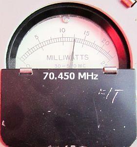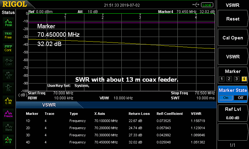 A vertical ½ wave dipole was used as a reference antenna in the attic and connected to a miliwatt meter. The power was measured at 70,050 MHz and 70,450 MHz. This is confirmed by the graphs of the Rigol and RigExpert analyzers.