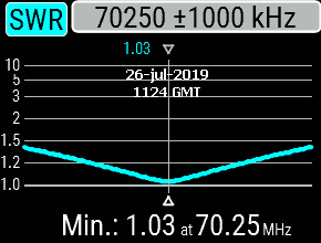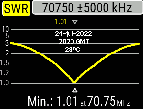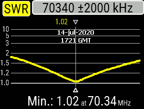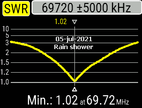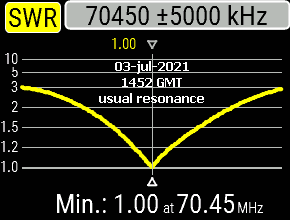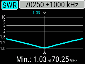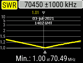 The adjustment was done with a RigExpert AA-230 zoom analyzer. At least a SWR = 1.03 could be achieved on 70.250 MHz. The SWR at the beginning and end of the band was better than SWR = 1.2.