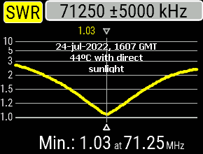 In extremely hot weather, metal expands and you would expect that the resonance point of the longer antenna would also go down. However, the opposite is true and the resonance goes up and even falls outside the band limit allowed for us, but the SWR always remained smaller than SWR < 1.04. In fact, no difference with the first measurements in 2019!