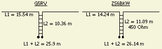 It is clear that the insertion of capacitors also can be worthwhile with G5RV and ZS6BKW antennas. The 450 Ohm ribbon line (fig») of my current antenna is extended in the shack so L1 + L2 = 28.30 m. Due to the capacitors SWR = 1 on 80 m and on 40 m SWR is decreased. With a YAESU FC-757AT tuner all 10 - 80 m bands can be adjusted for SWR<1.2. Except the 30 m band, it does not work or it is very difficult to match.
