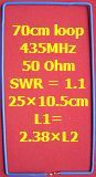 Om dat getal te verifiëren heb ik met blauw installatiedraad een aantal loops voor 70 cm gemaakt. In het midden van de band op 435 MHz was de SWR = 1.1 bij een afmeting van 25 × 10.5 cm.