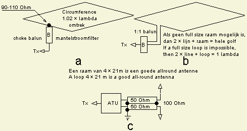 Een horizontaal raam (fig a) met een omtrek van ongeveer 84 m is een goede "all round" antenne voor 10 t/m 80 m en heeft geen uitgesproken DX of lokale eigenschappen.