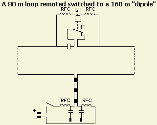 Als een 80 m quad als antenne voor 160 m gebruikt wordt, dan heeft het voedingspunt een zeer lage karakteristieke impedantie. Dat kunnen sommige antennetuners niet aan of er gaat teveel energie in het apparaat verloren. Men kan de antenne aan het andere uiteinde open laten zodat het een dipool voor 160 m wordt. Een mogelijke oplossing om dat op afstand te doen, ziet u hiernaast.