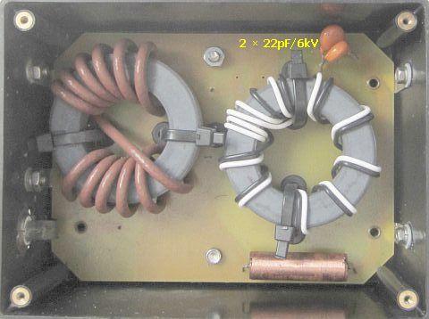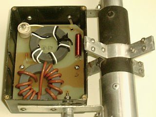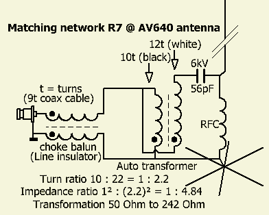 Bij toeval vond ik op eBay een losse aanpaseenheid van een AV640 of R7. Bij deze antennes is het aantal radialen vergroot en is er voor de 40 m band meer zelfinductie nodig. Daarom zijn voor zowel de choke balun als de auto transformator twee gestapelde ringkernen geplaatst. Gezien het aantal windingen van de trafo (10t + 12t) is de overzetverhouding 1 ÷ 2.2, ongeveer 1 ÷ 4.84. Door het systeem wordt de 50 Ohm asymmetrische impedantie van het voedingspunt omhoog getransformeerd naar een symmetrische impedantie van 50 × 4.84 = 242 Ohm.