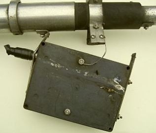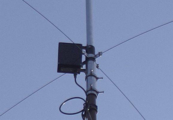 De antenne wordt uit het midden gevoed met een matching unit gemonteerd in een fragiel kunststof kastje dat bevestigd is aan een van glasvezel en polyesterhars gemaakte isolator. Als de laatste geruime tijd aan ons klimaat blootgesteld wordt, dan "verdampt" de hars aan de oppervlakte. De glasvezel wordt zichtbaar, is onbeschermd, werkt als spons en neemt vuil en stof op (foto re.).