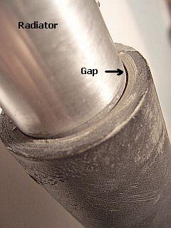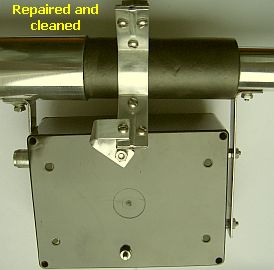 In de loop der tijd ging mijn antenne steeds schever staan en u kent dat wel, je stelt het onderzoek uit naar een geschikt moment met mooi weer. Te laat dus want ineens was de SWR op alle banden oneindig hoog. Er was een spleet ontstaan tussen antenne en isolator. Omdat de staaf door de wind heen en weer wiebelde, was de ruimte tussen buis en isolator geleidelijk groter geworden. Een van de bevestigingsbeugels van de matching unit kon de toenemende buiging niet meer aan en was door metaalmoeheid afgebroken. Daardoor was er geen contact met de antenne en dat veroorzaakte de slechte SWR.