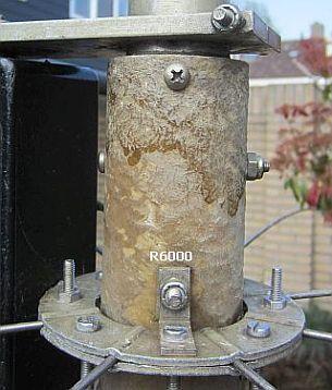 Door het uitboren van een popnagel kon de antenne uit de isolator gehaald worden. Het probleem was: hoe moest de antenne weer rechtop in de te ruime isolator vastgezet worden, want een scheve antenne is geen gezicht. Na het overwegen van (voor mij) ingewikkelde mechanische hulpmiddelen werd eerst een gemakkelijke methode geprobeerd. Aan de binnenkant van de isolator bracht ik met een kwastje een dunne laag twee componenten polyesterhars aan. Steeds werd na het opnieuw aanbrengen en uitharden van een dunne laag gecontroleerd of de staaf zonder speling in de buis paste. Eventueel werd de cilindrische vorm hersteld door de binnenkant te ruimen met een strook schuurpapier om een dunnere buis. Dat bleek goed te werken en toen alles mooi in één lijn in elkaar schoof, werd de antenne definitief met polyesterhars in de isolator gelijmd. In de plaats van de popnagel kwam een RVS bout en moer. De laatste werd eerst met polyesterhars aan de binnenkant van de aluminium buis gelijmd.