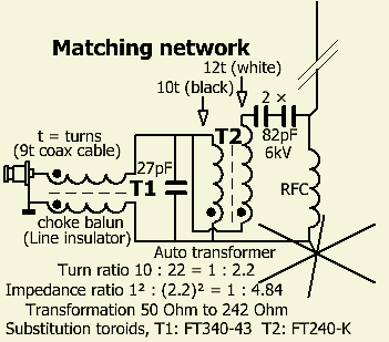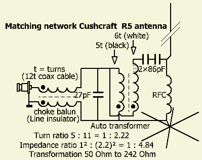 De matching unit is samengesteld uit een mantelsmoorspoel en auto transformator. Op diverse homepages wordt de laatste 1 : 4 balun genoemd. Ik weet niet of de fabrikant dat als zodanig heeft ontworpen, maar zoals het op de print gemonteerd is werkt het als auto transformator met een verhouding 1 : 4.84. Alle exemplaren die hier de revue gepasseerd zijn, waren op dezelfde manier op de printplaat aangebracht. U kunt zien dat de witte draad 6 × en de zwarte draad 5 × door de kern gaat. De wikkelverhouding is dus 5 ÷ (5 + 6) en de transformatie verhouding wordt dan 1 ÷ 4.84. De ingang van 50 Ohm wordt getransformeerd naar 50 × 4.84 = 242 Ohm. Het schema van het aanpassingscircuit werd getekend door de montage van de componenten op de printplaat te volgen. De asymmetrische voeding of OCF (off center feed) lijkt veel op het systeem dat in de FD3 en FD4 antennes van Fritzel toegepast werd.