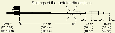 Voor het meten en afregelen werd voor elke band apart van 50 Ω coaxkabel een ½ λ of een veelvoud daarvan gemaakt voor koppeling met een antenne analysator of SWR meter. Als de antenne met deze kabel gevoed wordt, is aan de meetzijde de impedantie hetzelfde als dat van de antenne. Zo wordt het gemakkelijker om de resonantiepunten van de R5 te bepalen. Er werd metingen gedaan op de begane grond met de antenne op een 2 m hoge mast. Daarbij zijn, voor een lage SWR in het midden van elke frequentieband, door mij andere afmetingen met deze antenne van de diverse delen gevonden dan volgens de gebruiksaanwijzing zou moeten. De uitkomsten zijn ook in de tekening verwerkt. Het was kennelijk geen toeval dat twee van de drie gevonden lengtes het meetkundige midden zijn van de getallen in de handleidingen. Als u niet tevreden bent met de resonanties van uw R5 dan kunt mijn meetresultaten als richtlijn gebruiken om de antenne opnieuw af te regelen.
