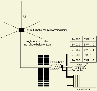 De SWR kan aan de bandgrenzen flink oplopen en dat kan voor moderne transceivers zonder antennetuner een probleem zijn. Hier wordt altijd een tuner gebruikt voor alle antennes en zo ook voor een R5 zie het volgende onderwerp.