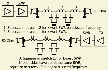 1. Sqeeze or stretch L2 for the lowest SWR on the selected frequency.