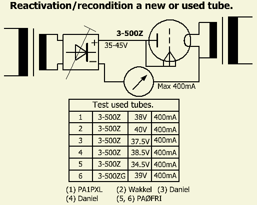 The reactivation is the easiest by heating in the amplifier. Disconnect the anode voltage and heat the tube for about one hour with the filaments on and put the fan off. Note: many ceramic tubes are overheated with the fan "off".