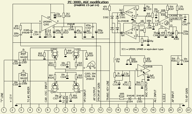 The voltage at pin 5 of Q201 PC-200 should not be more than ± 4 V for the proper functioning of the AGC. Because this pin is connected via 2.2 kΩ to pin 7 of Q301B, the two points almost have the same voltage. If the antenna is disconnected the voltage at point A (pin7 Q301B) is 4.36 V with R315 (PC-300C), R309 (PC-300D)= 1.5 kΩ.