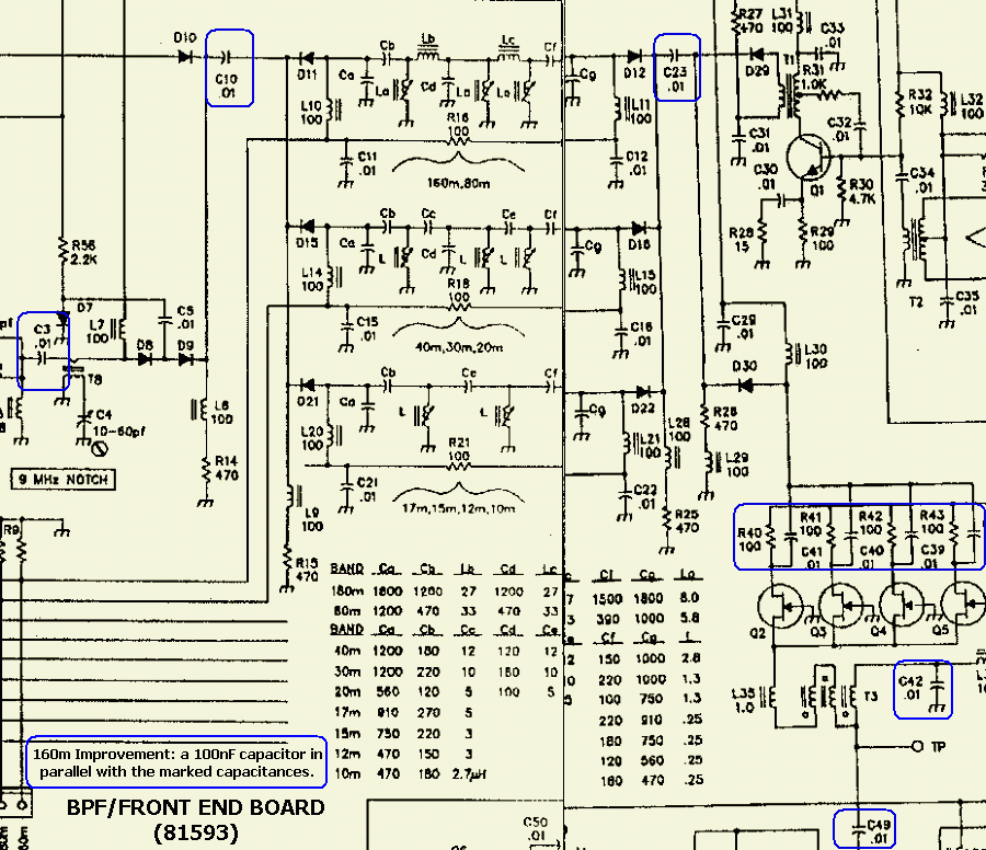 De totale koppelcapaciteit is voor het 160 m signaal te) klein, vooral ten opzichte van de signaalweg van ongeveer 50 Ohm. Van de antenne ingang naar de 4 × J30 voorversterker staan respectievelijk in serie C3, C10, C23 en dan in serie met parallel aan elkaar C38, C39, C40, C41. Dat is in totaal maar (3.3 × 40) : (3.3 + 40) = 3 nF! Ook C42 (10 nF) en C49 (10 nF) zijn onvoldoende. Door aan de sporenzijde van de print een 100 nF condensator parallel aan elk van de genoemde capaciteiten te monteren, geeft de S-meter vrijwel hetzelfde aan als op de andere banden. Een aanmerkelijke verbetering ten opzichte van de originele opzet. Het vergt wel enig speurwerk om aan de onderzijde van de print de juiste componenten te vinden. De (fig») de foto's kunnen u daarbij op weg helpen.